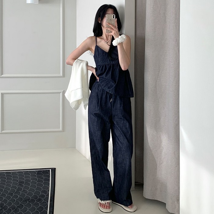 세트가격 어던무드 청 셋업 생지 데님 뷔스티에 나시 와이드 팬츠 청바지 바캉스룩