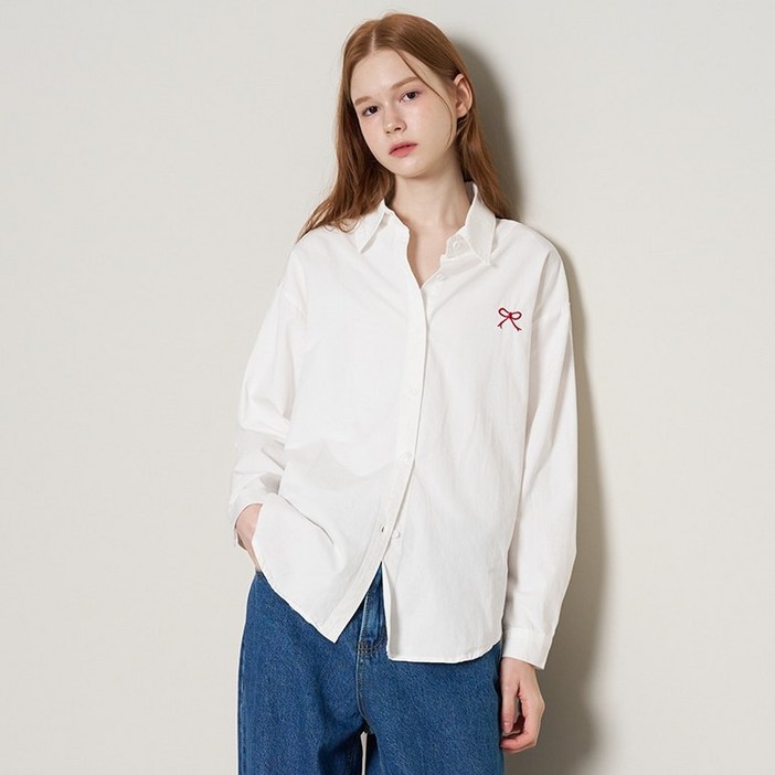 르샵 여성용 베이직 박시핏 리본 자수 긴팔 셔츠 DP3BA050A