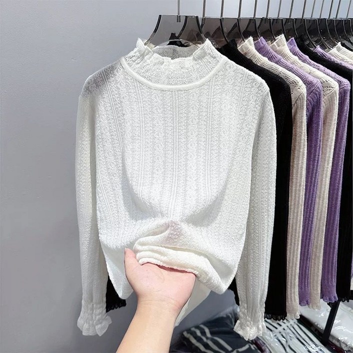 메인워크 여성 반폴라 레이스 블라우스 봄 가을 소프트 간절기 스판 심플 루즈핏 데일리 베이직 고급 패션 터틀넥 상의